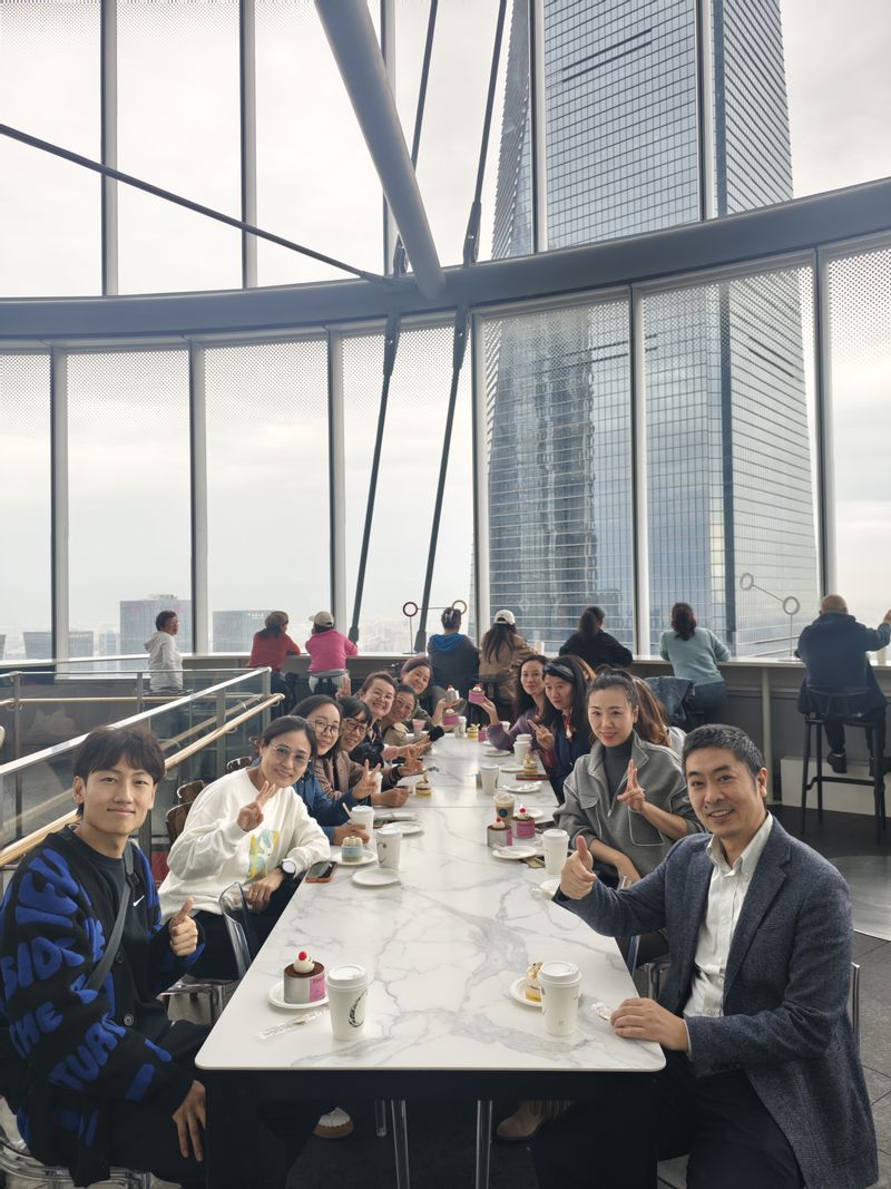 此次参观的登楼体验让教工们直呼震撼。大家搭乘速度达18米/秒的世界最快电梯,仅55秒便直达546米高的118层观光厅。站在观景台,教工们360度俯瞰陆家嘴金融贸易区全貌,清晰观赏到陆家嘴"三件套"的恢弘格局与黄浦江的蜿蜒景致,不少教工拿出手机记录这一城市全景,感慨上海建设发展的日新月异。此次活动,还安排教职工到上海中心52层的朵云书院休闲读书,大家在此感受"云端读书"的独特氛围,交流教育。